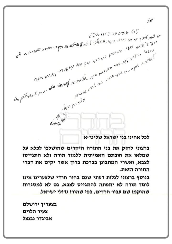 “Even a Chareidi bochur who, unfortunately, is not learning Torah, must not be tempted to enlist in the army—not even in frameworks established for Chareidim—as the Gedolei Yisrael have already instructed.”